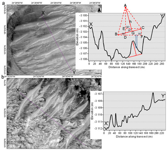 To our knowledge, we did not find any research paper which exclusively provides published accounts of TAR morphometrics in Oxia Planum. In addition to the conventional TAR morphometric parameters (W, L, λ, a, and s) as defined by Balme et al. [10], we also derived slope, orientation, and heights for the selected TAR samples. However, before we discuss the results, we would reiterate that the selected TAR samples for this analysis are representative of only simple TAR morphologies in the study area. Figure 8 presents two of the transects which were used to derive height (h) of 50 TARs with clearly distinct crests and troughs. The Pythagoras’ theorem was used for the h calculations (Figure 8a). BF (i.e., L), BD, and EC in Figure 8a can directly be derived using the planimetric measurements on the HiRISE images. Similarly, elevation differencing between the two points on the DTMs can directly provide AE, CF and AD. Afterwards, using the Equations (1) to (6), we can derive h. We have five right-angled triangles in Figure 8a to derive the required height (h); ∆CFB, ∆ADB, ∆AEC, ∆AGB, and ∆AGC. From these right-angled triangles, we can derive the following equations: