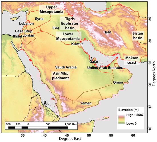 Study area of the Middle East. Red line depicts area of interest and national borders. Background Digital Elevation Model (DEM) provided by United States Geological Survey (USGS) has a 3 km spatial resolution and is represented as meters above mean sea level. Places mentioned in text shown in white boxes.