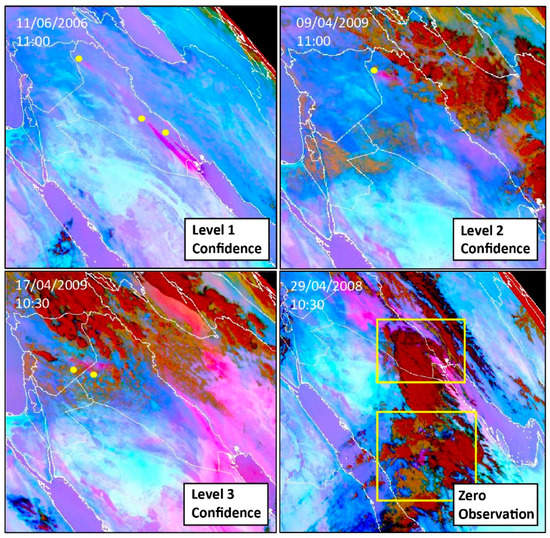 We assign a degree of confidence (DOC) score to each dust event (Figure 2) to indicate conditions where the visual identification of the dust signal becomes difficult, such as in the presence of meteorological clouds and high atmospheric water vapor content []. This enables us to examine seasonal variations in our ability to detect dust sources from the different temporal resolution datasets, which arise from meteorological conditions. The uncertainty is evaluated on a scale from 1 to 3 (where ‘Level 1’ indicates the highest confidence and ‘Level 3’ the lowest) and is recorded alongside each dust event.