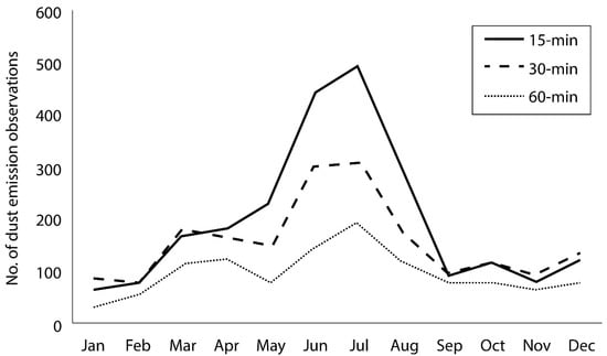 Figure 3 shows annual cycles of dust emission frequencies derived using data with different temporal resolutions. A reduction in the monthly frequencies of dust events with a decrease in temporal resolution of the acquired imagery was evident, particularly between May and August. A decrease in temporal resolution from 15-min to 60-min resulted in a reduction of the total number of events of 50% over the year. The use of 30-min observations resulted in recording 17% fewer events than using the 15-min data.