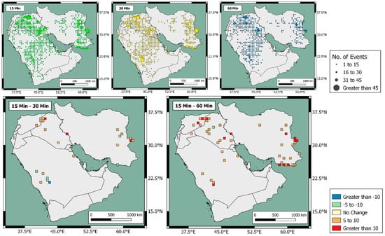 Analysis of the spatial distributions of the datasets identified a distinctive change in pattern, particularly in data retrieved at 60-min time steps (Figure 4). Figure 4 describes the differences in the number of observations observed in each 0.5° grid cell when compared to the 15-min dataset. To highlight only areas of significant change in each cell, Figure 4 includes only cells where the difference in the number of observed events is greater than five when compared to the 15-min dataset. The comparison highlights a greater consensus between the 15-min and 30-min datasets (Figure 4, bottom left panel), producing fewer grid cells of significant difference than the 15-min and 60-min comparison (Figure 4, bottom right panel). Compared to the 15-min dataset, both the 30-min and 60-min datasets show the greatest difference in areas of highest emission frequency (Figure 4, bottom panels), such as Upper Mesopotamia in Iraq and Syria (35°–36°N; 40°–42°E) and the Sistan Basin, Iran (30°–31.5°N; 61°–62°E); see Figure 1 for locations. This is because, in the main dust-producing areas, the higher temporal resolution data are able to pick out more detail, and therefore distinguish more individual events. There are some exceptions evident, notably in the 15- and 30-min comparison in Saudi Arabia. Here, the dust emission events, while frequent, were relatively small, and several were missed in the 15-min analysis, highlighting a limitation of the manual detection method. Furthermore, the 60-min datasets fails to identify dust emissions along the coastline (Figure 4, bottom right panel), omitting a significant number of observations along the Makran Coastline, Iran (25°–26°N; 57°–61°E). However, these events are detected equally well in the 30-min and 15-min data, although the DOC levels are lower here as a result of meteorological cloud cover.