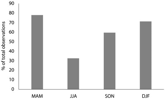 Percentage of dust events in the study area with degree of confidence level 2 or 3 in all three datasets, demonstrating the variation between seasons.