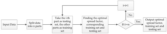 where n is the sample dataset size and p is the dimension of X. The only parameter in GRNN is the smoothing factor . When is too large, Y) approximates the mean value of Y in the sample set, indicating that the model is underfitting. When is too small, Y) is close to the training set, indicating that the model is overfitting. Therefore, the smoothing factor and the selection of the training set are very important. In this paper, the cross-validation method is used to choose the optimal and the optimal training set. The algorithm is shown in Figure 1.
