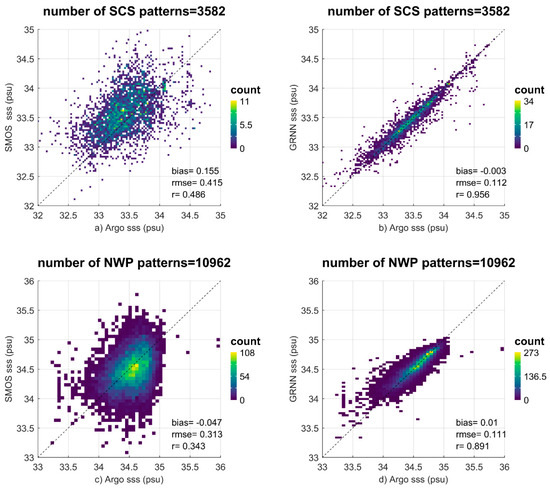 - Compared with Argo floats data, in addition to the northwestern Pacific, the errors in SSS product have also been reduced significantly in the northern SCS after being corrected by GRNN. The bias and RMSE are reduced to the order of 0.01 PSU and 0.1 PSU. The mean bias and RMSE compared with ISAS-15 SSS for the period of 2012–2014 are reduced and the variability of the corrected SSS maintains the same order as SSS of the ISAS dataset.