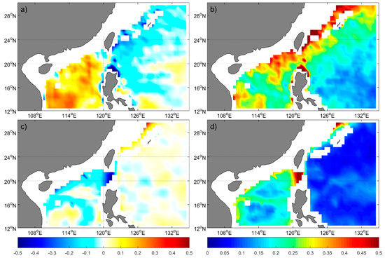 (a) Mean bias of the SMOS SSS compared with the In Situ Analysis System (ISAS) gridded SSS map from 2011 to 2014. (b) Root mean square error (RMSE) of the SMOS SSS compared with the ISAS. (c) Same as (a) but for the corrected SSS. (d) Same as (b) but for the corrected SSS.