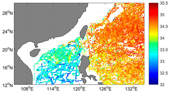 To be more objective, the impact of SSS assimilation on the subsurface salinity is verified with the CTD observations from the northern SCS sailing data that have not been used in the GRNN and the assimilation. Additional experiments were carried out during the 12/08/2012–21/08-2013 period for consistency with the CTD observational period. The observational map is shown in Figure 9.