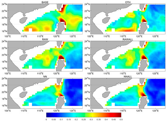 We evaluated the assimilation effect by comparing the model SSS residual with the ISAS-15 SSS for the period of 2012–2013, the results are shown in Figure 6. There were large SSS errors in the BASE experiment (~0.3 PSU in the research region), which were expected because no data were assimilated in the BASE experiment. The raw SSS assimilation led to a slight improvement over the BASE experiment due to the large error in raw SSS (EX2). However, the SSS errors are less than 0.1 PSU in the northwestern Pacific and 0.15 PSU in the northern SCS after the SSS is corrected and assimilated into the model, (EX3, Figure 6, NN), which is also verified in the NNALL experiment (EX6), indicating that the assimilation of the corrected SSS can improve the model SSS simulation.