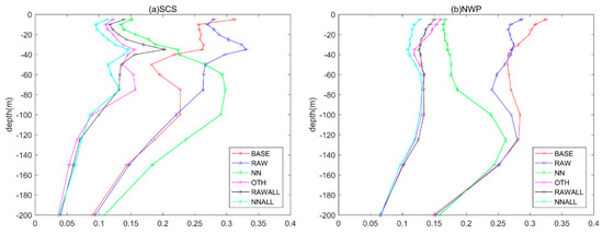 The SSS corrections are likely to propagate vertically through the background error covariance and model dynamics, and SSS assimilation can impact subsurface salinity simulations, which has been demonstrated on a global scale by Lu et al. and G. Vernieres et al. [15,16]. Whether the SSS preprocessed through GRNN yields a positive impact on the subsurface layer in northern SCS needs to be verified, and the question of SSS influence depth is also of concern. The subsurface SSS are compared with the EN4 dataset, as shown in Figure 7 (the locations of observation are shown in Figure 8). The raw SSS data assimilation deteriorated the subsurface salinity field to a depth of 100 m. The corrected SSS assimilation improved the subsurface salinity field compared with the BASE experiment, except in the thermocline [45]. However, the thermocline errors can be reduced by assimilation of T/S profiles, such as in OTH and NNALL experiments. The influence depths of the corrected SSS are different in the northern SCS and northwestern Pacific. Compared with the BASE experiment, the corrected SSS yields a positive impact at the 150 m depth in the northwestern Pacific but is only positive at 40 m in the northern SCS. One reason is the difference in seawater properties between the SCS and the northwestern Pacific [46].