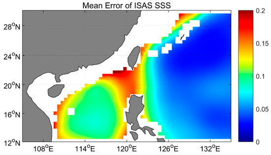 The mean error of ISAS15 topmost layer salinity for the period of 2011–2014.