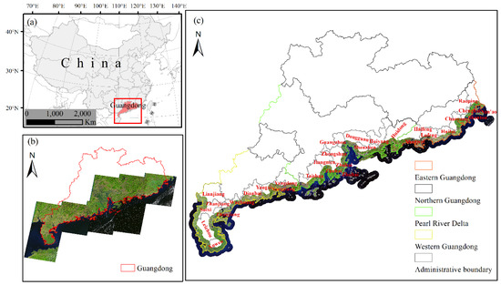 Guangdong Province is located at 20°13′~25°31′N, 109°39′~117°19′E, as shown in Figure 1a. The province has 3368 km of mainland coastlines and 1805 km of island coastlines, with 1288 km of silt coastlines, 498 km of which are suitable for the growth of mangroves [37]. The mangroves in the region grow along the coastline between Raoping County (23°32′21″N, 116°57′22″E) and Lianjiang City (21°33′36″N, 109°45′03″E) [38]. Considering that mangrove ecosystems mainly distribute in the intertidal zone, the study area was limited within a buffer zone along coastal line with seaward and landward buffer distance of 10 km. Additionally, the spatial distribution of mangroves along the coastal lines in this province presents great differences, which are further discussed based on the three subregions—Eastern Guangdong, Pearl River Delta, and Western Guangdong—with the consideration of their geographical features. The province has an annual average temperature of 21.9 °C and an average annual rainfall of 1790 mm [39]. The region has both subtropical monsoon and tropical monsoon climates, and it is the most rainy region with the longest flood season among all the provinces in China; notably, the area is frequently affected by tropical cyclones, rainstorms, droughts, typhoons, strong winds, and other factors [39].