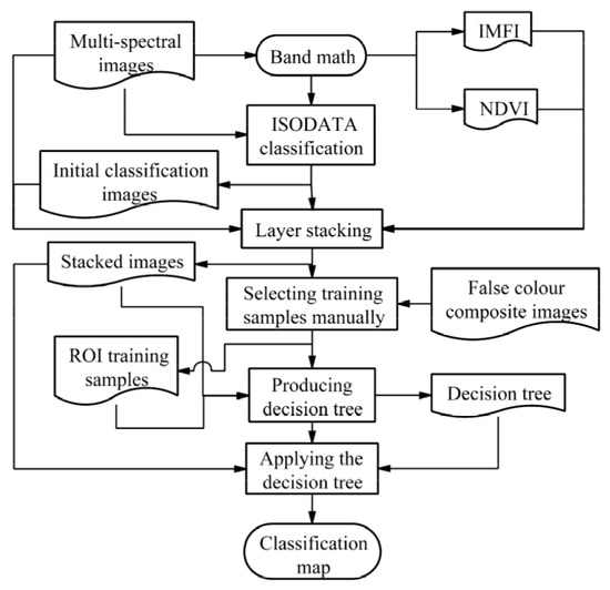 In this study, the original multi-spectral images; Normalized Difference Vegetation Index (NDVI) data, which is expressed as Formula (1); Inundated Mangrove Forest Index (IMFI) data, as proposed by Jia [41] and calculated using Formula (2); and the initial classification imagery obtained from ISODATA, were added as bands to improve the ROI separability. The NDVI, which ranges from −1 to 1, is an indicator of the health and density of vegetation, and a higher density of green leaves results in a value close to 1 [42]. The IMFI can help to distinguish between submerged mangroves and sea water. Evenly distributed samples were selected to create decision trees, and the ROI separability values between different samples were greater than 1.8, which indicated that the samples were suitable.