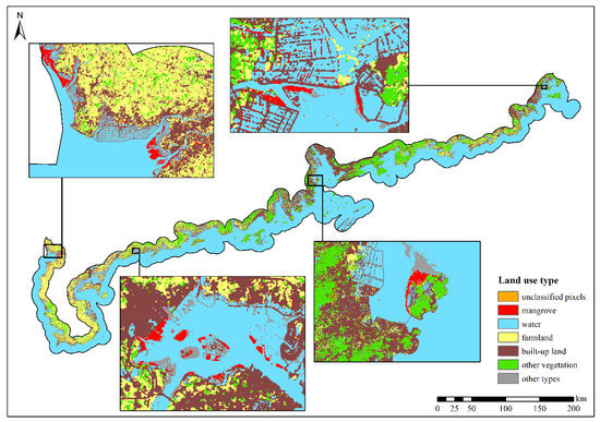 Mangrove forests are among the most productive ecosystems on Earth and can be found at tropical and subtropical latitudes [1,2,3]. This ecosystem has received increasing attention from not only ocean and land managers but also academia and conservation communities [4,5] due to its important ecological and societal functions [6,7], such as providing food and breeding areas as well as nursing grounds for many fauna, reducing pollution, precipitating fine sediments, protecting coastlines, and storing carbon, among other functions [8,9,10,11,12,13]. However, mangroves have undergone rapid spatiotemporal variation worldwide, especially in developing areas [4], and the integrity of this ecosystem has changed at an alarming rate because of both natural and anthropogenic influences, especially extreme weather events; relative sea level rise; activities related to development, such as urbanization and highway construction, and the installation of shrimp and fish ponds [14]. Regular monitoring of the spatiotemporal characteristics of mangrove ecosystems could provide dynamic information to allow optimal coastal management policy to be formed in the future [15].