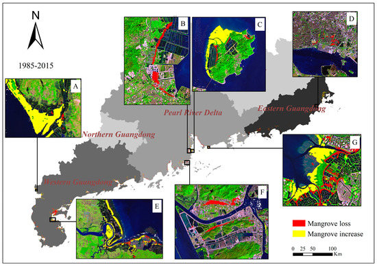 The mangrove areas in the coastal zone of Guangdong Province were about 9305, 9556, 6793, and 9700 ha in 1985, 1995, 2005, and 2015, respectively. Notably, the area displayed an increase of about 251 ha from 1985 to 1995, a sharp decrease of about 2762 ha from 1995 to 2005, and a sharp increase of about 2907 ha from 2005 to 2015. From 1985 to 2015, a net increase of about 1816 ha mangrove was observed in Western Guangdong. For example, as subgraph A in Figure 7 shows, a substantial increase in mangroves occurred in the national nature reserve in Zhanjiang City, which was established in 1990. Different from Western Guangdong, the Pearl River Delta and Eastern Guangdong showed net decreases of about 1173 and 248 ha, respectively, from 1985 to 2015. Most areas exhibited mangrove loss because of sea reclamation (subgraphs D and F) and aquatic breeding (subgraph B). In PRD, the mangrove area also increased in many zones, for example, substantial mangrove increases occurred in the nature reserve on Qi’ao island (subgraph C) and at Mai Po Inner Deep Bay Ramsar Site (subgraph G). In EG, increases and decreases in mangroves were both rare due to the limited distribution of mangroves in the region. Mangrove loss always occurred landward, and increases often occurred seaward (Figure 7). In addition, the spatial pattern of mangrove distribution transformed from fragmented to aggregated.