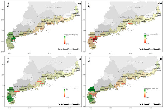 Temporal variation in the mangrove distribution at county and city level (Negative value means decrease, and positive value means increase): (a) from 1985 to 1995, (b) from 1995 to 2005, (c) from 2005 to 2015, (d) from 1985 to 2015.
