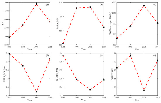 Class metrics of mangrove patches: (a) NP: Number of Patches, (b) PARA_MN: Mean Perimeter-Area Ratio, (c) PD: Patch Density, (d) AREA_MN: Mean Patch Area, (e) SHAPE_MN: Mean Shape Index and (f) COHESION: Patch Cohesion Index.