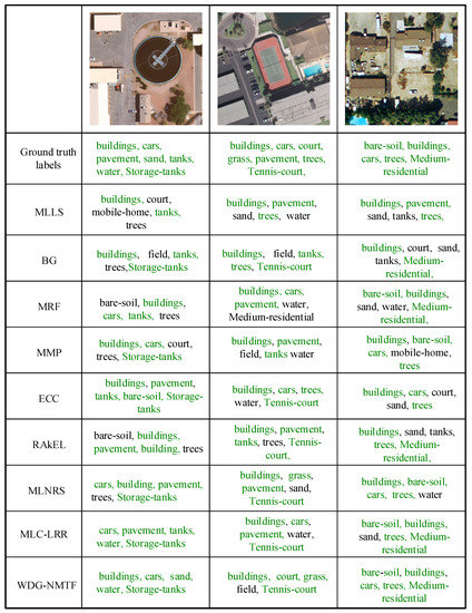 Generative models usually use latent topics to represent image–label relationships, such as variants of latent Dirichlet allocation (LDA) [24], author topic model [9,12], constrained non-negative matrix factorization [25,26], and tag completion [27]. In [24], the authors used the LDA model to annotate satellite images. In [9] and [12], the authors used the label information in an author-topic model and genre information in an author-genre topic model to improve image annotation performance. A probabilistic method in [25] was proposed to fill the missing tags of images via collaborative filtering. In [26], a constrained NMF method, incorporating label information, was introduced to solve a multi-label learning problem. Similar to ours, an image-tag completion algorithm was employed in [27] to solve the missing tags of the images. However, they used linear learning, while we used an NMF-based CF framework. Moreover, they addressed the image retrieval problem, while we solved the multi-label remote sensing image annotation problem.