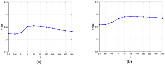 There is often a risk of overfitting when the image–label matrix is very sparse. The cold-start problem is a special example. To avoid this risk and to enhance the robustness of the proposed method, we took into account the Tikhonov regularization terms in the above equation. Moreover, to enhance its scalability, we introduced an indicator matrix and obtained our final objective function as: