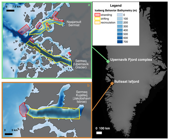 Examination of the overlays suggests that regions of stranding and drifting correspond with relative bathymetric highs and lows (i.e., shallower and deeper water), respectively (Figure 1 and Figure S1). In basins without measured bathymetry for confirmation, deeper regions inferred by rapid iceberg transport may indicate the presence of deep troughs that channel subsurface water on the shelf towards the glacier terminus. An investigation of relative iceberg drifting speeds and pathways, while beyond the scope of this study, may provide additional insight into the fjord’s bathymetric shape in these locations. Regions where icebergs were observed to recirculate without becoming stranded indicate areas with a more complicated bathymetry and tend to occur proximal to land features, particularly those associated with non-linear fjord geometries.
