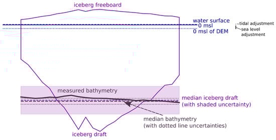 The premise of our approach is that the draft of stranded icebergs grounded on bathymetric highs can be used to infer the water depth in each iceberg’s location. Iceberg draft depends on the iceberg’s shape [32,33], which is non-unique, and ratios of iceberg draft to width vary [32,34,35,36], making draft difficult to infer solely from measurements of surface dimensions. Here we infer iceberg drafts from freeboard observations assuming simplified submerged geometries (Figure 2) as described below.