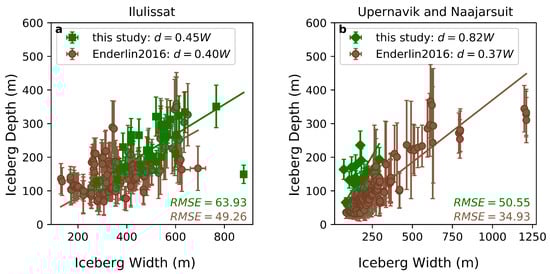 Depth–width ratios in Ilulissat and Naajarsuit Fjords. Green squares/diamonds show the results from this study, while brown circles show results from Enderlin2016. Best fit lines are used to determine the depth–width ratio, with RMSE values as shown and statistically significant p values (<0.05) for all fits. (a) Results in Ilulissat Isfjord. (b) Results from the Upernavik region, where the icebergs comprising the two datasets were derived from different parent glaciers.