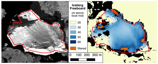 The requirements and challenges of creating DEMs using ASP are discussed in more detail in Enderlin and Hamilton [38] and Shean et al. [37]. The presence of large areas of open water around icebergs poses a challenge to the pattern matching employed by ASP, often resulting in DEMs with large areas of no data and spurious heights of tens of meters for some open water pixels. Each stranded iceberg DEM was inspected to confirm that enough of the iceberg was successfully mapped and the quality of the DEM was high enough to provide a representative range of freeboard values as well as accurate sea level adjustments (typically 1–5 m after the influence of tidal height is removed). Areas used for sea level adjustment were carefully selected to avoid inclusion of spurious open water pixels. Inclusion of these pixels otherwise resulted in unrealistic sea level adjustments (>10 m), consequently providing poor estimates of water depth.