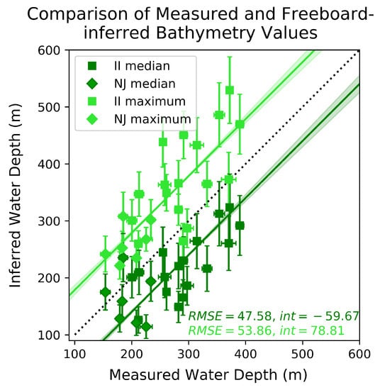 Measured and freeboard-inferred water depths for stranded icebergs in Ilulissat and Naajarsuit Fjords. Depths are in meters relative to 0 msl of the local geoid. Inferred depths are derived using the freeboard method, as described in the text. The light green (dark green) points compare the maximum (median) inferred and measured values. The intercept (int) and RMSE value for the best fit lines (forced slope of one) are shown in the corresponding color. Squares (diamonds) correspond to icebergs stranded in Ilulissat Isfjord-II (Naajarsuit Fjord-NJ). The black dotted line shows a 1-1 relationship.