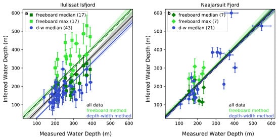 Comparisons of measured and inferred water depths for stranded icebergs using both remote sensing methods. Depths are in meters relative to 0 msl of the local geoid. Inferred depths are derived using the freeboard (squares/diamonds) and depth–width ratio (circles) methods. (a) Results from Ilulissat Isfjord. (b) Results from Naajarsuit Fjord. The black dotted line shows a 1-1 relationship. Black, green, and blue solid lines show best fit lines (forced slope of one) to the data (the methods combined (all symbols), the freeboard method (squares/diamonds), and the depth–width ratio method (circles), respectively) with shaded 95% confidence intervals. The RMSEs and intercepts of the best fit lines are shown in Table 2 in corresponding colors. The number of stranded icebergs used for each method is shown in parentheses in the legend.