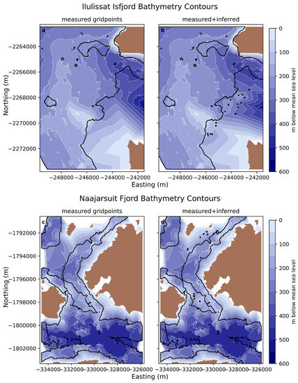 In Naajarsuit Fjord (Figure 7c,d), the deepest portions of the fjord are well mapped. However, water depths inferred using remote sensing in the shallow regions between the measured transects provides added detail on the nature of shallowing towards small islands situated within the fjord. This is illustrated well in the northern extent of Figure 7c,d, where four stranded icebergs indicate water depths in excess of those derived from interpolation between sonar-based measurements and land.