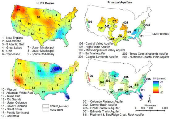This study was carried out to understand the changes in storage over Hydrologic Unit Code 2 (HUC2) surface basins and principal groundwater aquifers in CONUS (Figure 1). The U.S. Geological Survey (USGS) has divided the United States into hydrologic units that are identified by unique numeric HUCs []. The entire United States is divided into 21 major surface regions (HUC2), composed of 222 sub-regions (HUC4) that are further divided into smaller basins (HUC6) and sub-basins (HUC8). The boundaries of these units are defined in terms of topographic river basin divides and sub-basins. The hydrologic unit code represents two digits each to indicate region, sub-region, basin, and sub-basin. In this study, we use 18 HUC2 surface basins covering CONUS. The approximate mean area of HUC2 is 500,000 km2. Boundary information for all HUCs is obtained from the USGS (https://water.usgs.gov/GIS/huc.html). Twelve aquifers in the CONUS region were selected from the USGS Ground Water Atlas of the United States (https://water.usgs.gov/ogw/aquifer/atlas.html). The aquifer boundaries derived from this map indicate the areal extent of the uppermost principal aquifer system on a national scale. A principal aquifer system is a regionally extensive aquifer or aquifer system that has the potential to be used as a source of water abstraction for human or agricultural use.