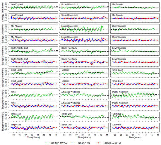 Time-series plots of monthly GRACE TWSA for the HUC2 surface basins in conterminous United States (CONUS) during 2003–2016. Dashed lines indicate the slope and decadal trend. LTM stands for long term for annual (ΔSANN) and decadal (ΔSDM) change in storage. The “M” in x-axis represents a decadal time scale.