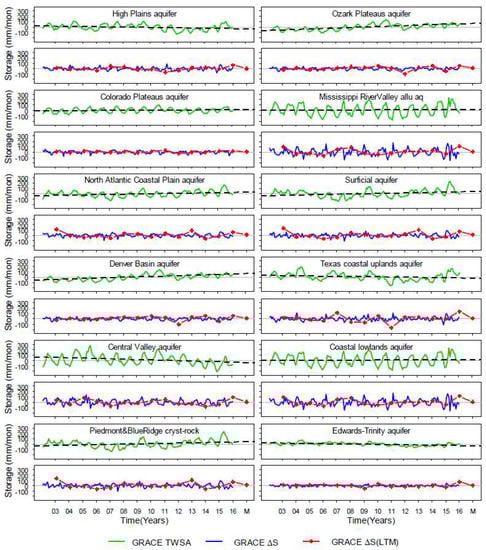 Time-series plots of monthly GRACE TWSA for the principal aquifers in CONUS during 2003–2016. Dashed lines indicate the slope and decadal trend. LTM stands for long term for annual (ΔSANN) and decadal (ΔSDM) change in storage. The “M” in x-axis represents a decadal time scale.