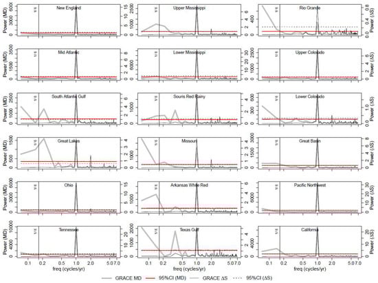 Scaled periodograms of basin-average spectra for GRACE TWSA (grey line) and GRACE ΔS (black line) derived for the surface basins. The red and the dashed black lines are the 95% confidence intervals for TWSA and ΔS, respectively.