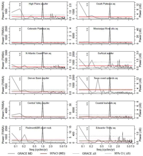 Scaled periodograms of basin-average spectra for GRACE TWSA (grey line) and GRACE ΔS (black line) derived for principal aquifers. The red and the dashed black lines are the 95% confidence intervals for TWSA and ΔS, respectively.