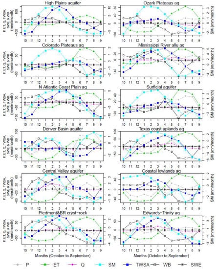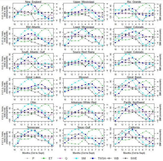 The description of other datasets used in this study is presented here. Mean basin precipitation (P) over 2003–2016 was extracted from 4 km monthly parameter-elevation regressions on independent slopes model (PRISM) precipitation datasets [,] (http://prism.oregonstate.edu/historical/). Monthly basin runoff (Q) was extracted from gridded runoff data (2003–2016) obtained from the U.S. Geological Survey’s WaterWatch (https://waterwatch.usgs.gov/?id=romap3). Monthly regional evapotranspiration (ET) data were extracted from 1 km operational simplified surface energy balance algorithm (SSEBop) ET data (2003–2016) produced from model-assimilated weather datasets and Moderate Resolution Imaging Spectroradiometer (MODIS) thermal images [] (https://earlywarning.usgs.gov/useta). Monthly snow water equivalent (SWE) was computed from Advanced Microwave Scanning Radiometer for Earth observing system (AMSR-E) L3 25 km ease grids (2003–2009) obtained from the National Snow and Ice Data Center [] (http://nsidc.org/data/ae_mosno). Monthly soil moisture (SM) data (0–2 m) were obtained from National Land Data Assimilation System (NLDAS-2) monthly mosaic land surface model level 4 climatology data (0.125 × 0.125 degree) available from NASA (https://disc.gsfc.nasa.gov/datasets/NLDAS_MOS0125_MC_V002/summary) [].