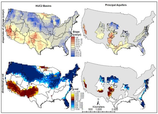 Several regional studies in the past have used GRACE TWS to understand change in storage over time [] and decadal trends in TWS, for example, groundwater depletion in India [,] and TWS changes in the U.S. in California’s Central Valley [,] and in the High Plains aquifer region [,]. More recently, GRACE-derived TWS was used to estimate emerging trends in global freshwater availability []. Most of these studies have provided estimates of rate of change (mm/year) in storage obtained from GRACE. In this study, we perform the seasonal Mann-Kendall (SMK) test [], using “rkt” package in R statistical software, using monthly GRACE TWSA over 2003–2016. For each basin, the Theil-Sen’s slope and 5% significance level (p-val ≤ 0.05) were estimated. For easy interpretation, we converted significance levels to directional p-val (containing both positive and negative p-val) based on the direction of the slope. This analysis of change in storage was performed both at the basin scale and at the pixel level to identify regions showing significant changes in storage.
