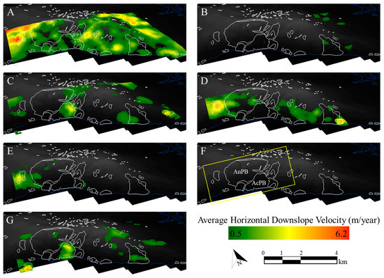 Incremental average horizontal downslope velocity (m/year) between chronological Worldview-2 image pairs. (A) 20 February 2011–29 May 2011; (B) 29 May 2011–17 February 2012; (C) 17 February 2012–9 November 2012; (D) 9 November 2012–15 September 2013; (E) 15 September 2013–29 March 2014; (F) 29 March 2014–17 September 2015; (G) 17 September 2015–16 February 2016. AnPB and AcPB are referenced in (F) and the yellow rectangle delineates the approximate extent of the reference map provided in Figure 1.