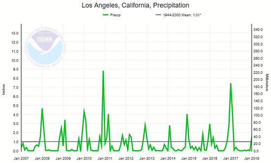 - National Oceanic and Atmospheric Administration (NOAA). Climate at a Glance. 2018. Available online: https://www.ncdc.noaa.gov/cag/city/time-series/USW00023174/pcp/all/6/2007-2018?base_prd=true&firstbaseyear=1944&lastbaseyear=2000 (accessed on 1 March 2019).