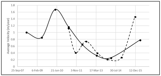 AcPB Body. As mentioned before, this is one of the more active areas within the landslide complex. A lack of PS suggest decorrelation due to rapid deformation (which occurs at a velocity > 2.5 cm/year). PS that border AcPB exhibit velocity around −8 mm/year. PS presence within AcPB appear to act as a boundary around high landslide activity areas, which are approximated well by GPS displacement measurements (yellow, orange, and red arrows in Figure 2).