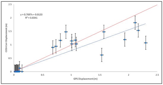 Graphical comparison of displacement measured by GPS (x-axis) and COSI-Corr (y-axis) from 2012 to 2016 at 55 GPS stations. Line of best fit shown as blue dashed line (see Table 4 for additional details). Line of 1:1 slope shown as red line (GPS displacement = COSI-Corr displacement).