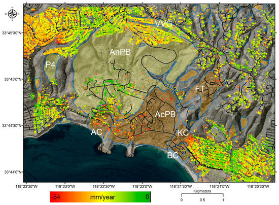 Neither GPS nor COSI-Corr can accurately measure extremely slow deformation of < 16 mm/year [29], so PSI is required for these measurements. Figure 7 shows PSI average velocity measurements between 19 July 2012 and 27 September 2014 across the Portuguese Bend landslide complex. PSI average velocity is measured in the line-of-sight direction (26° from nadir, N85°W), with negative values indicating ground movement away from the satellite (which corresponds to downward and/or westward directions). There are five areas of interest that stand out when comparing PSI results with GPS and COSI-Corr: (1) AcPB Body, (2) AC and AcPB Toe, (3) KC, (4) AnPB, and VVG Scarp Reactivation, and (5) P4.