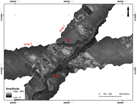 Uncalibrated amplitude map of two overlapping strips. Note the extreme differences between the edge of Strip 2 and Strip 1, as indicated by the red arrows. Visualization: 1 m spatial resolution raster using the median amplitude last echo point values for each cell. Coordinate System: WGS84 UTM Zone 33N.