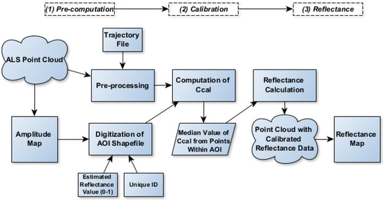The calibration process is divided into three parts: (1) Pre-computation of the calibration attributes, (2) derivation of the calibration constant (), and (3) reflectance calculation and generation of a reflectance map from the calibrated data in the point cloud (Figure 4):