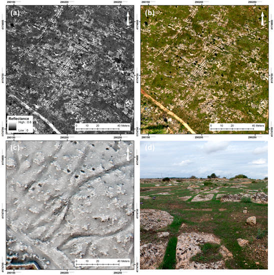 Additionally, the reflectance values clearly delimit the extensive groups of animal-drawn vehicle ruts that crisscross the exposed bedrock in our project area (Figure 11). These anastomosing networks are relicts of the former landscape infrastructure in the region, and serve as important indicators of trade, transport, and other movement throughout the area. While such networks have been extensively studied in other areas, such as Malta and the Azores [45,46,47], their history has yet to be explored in western Sicily. Although the route relicts sometimes reach lengths of over 100 m, the individual tracks do not always manifest in terrain-derived visualizations of the ALS data, possibly due to a combination of effects that include their narrow feature dimensions (individual tracks have widths of approx. 50 cm and depths of up to approx. 60 cm), filtering and interpolation of the elevation models. Some are shallow and appear to have been less frequently used, while others are set much deeper into the bedrock. Furthermore, they are often filled with soil and/or emergent vegetation, both of which could contribute to their low relief manifestation (Figure 11d). However, the terrain-based visualizations have other advantages, such as depicting the outlines of the more topographically prominent of the linear features, which may indicate that particular strands in the network were used more heavily than others. Figure 11 shows the complimentary nature of the terrain, orthoimage, and reflectance-based visualizations. While the terrain visualization indicates the direction, extent, cross-cutting, and depths of the more prominent parts of the network, the reflectance and RGB images detail individual tracks and allow for an estimation of the relative use-wear of tracks based on their color and reflectance. Therefore, we found it advantageous to use the reflectance map in conjunction with other data sets to delimit the properties of these features.