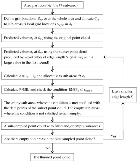 In recent years, free access to an increasing number of LiDAR (i.e., Light detection and ranging) databases (e.g., the OpenTopography Facility of US and the LiDAR databases from The Environment Agency of the UK) is available to promote the use of LiDAR point clouds. During laser scanning campaigns, the spatial resolution of data acquisition does not often take into account the spatial variation in the surface complexity. In addition, some local areas may be measured multiple times from different stations or flight paths. Consequently, oversampling may occur in some areas and can lead to a large volume of point cloud data, which is more than required for a given application [1,2,3]. This is more likely to be the case for use of open LiDAR data where users have no control on the spatial resolution of data acquisition. In those cases, to make the dataset more manageable and fit for purpose, a thinned point cloud can be sub-sampled from the original point cloud [4,5]. For applications of LiDAR point clouds in Earth science, this may be achieved by selecting a subset of the original point cloud (i.e., the subset selected is the thinned point cloud) or by removing a set of data points from the original dataset (i.e., the remaining data points constitute the thinned point cloud). In either case, the coordinates of individual data points are not altered during the process of thinning from the original point cloud to the reduced one.