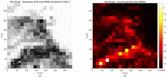 It is expected that more data points should be selected in sub-areas where the surface is more complex. To confirm this, a local surface roughness map was produced using the local root mean square height (RMSH) method, which is a roughness metric applied widely in Earth Science [27,28]. The window size used for calculating the RMSH was the same as that for the individual sub-areas for data sampling. The local surface roughness (shown in Figure 4b) has an evident correlation with the local data density (in Figure 4a).