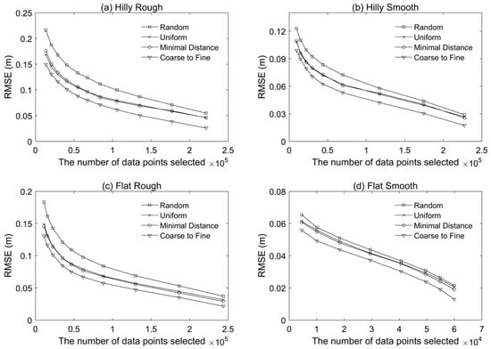 The RMSE versus the number of data points of thinned point clouds for the four terrain surfaces: (a) hilly rough, (b) hilly smooth, (c) flat rough, and (d) flat smooth.