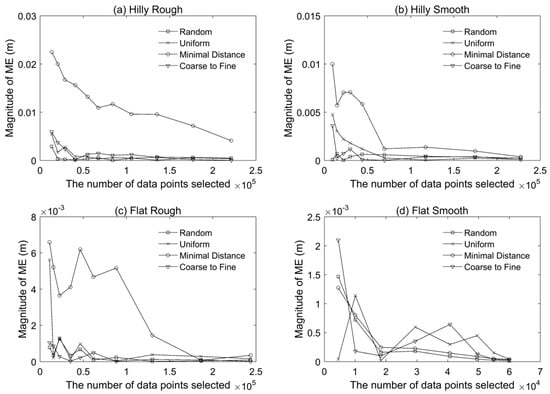 The magnitude of mean error (ME) versus the number of data points of thinned point clouds for the four terrain surfaces: (a) hilly rough, (b) hilly smooth, (c) flat rough, and (d) flat smooth.