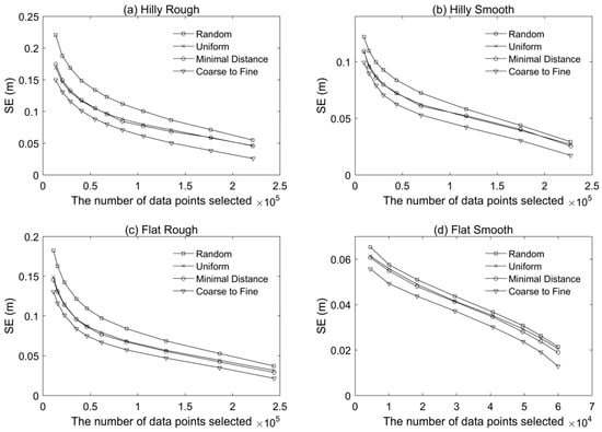 The standard error (SE) versus the number of data points of thinned point clouds for the four terrain surfaces: (a) hilly rough, (b) hilly smooth, (c) flat rough, and (d) flat smooth.