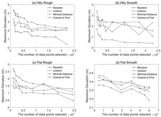 The maximum deviation versus the number of data points of thinned point clouds for the four terrain surfaces: (a) hilly rough, (b) hilly smooth, (c) flat rough, and (d) flat smooth.