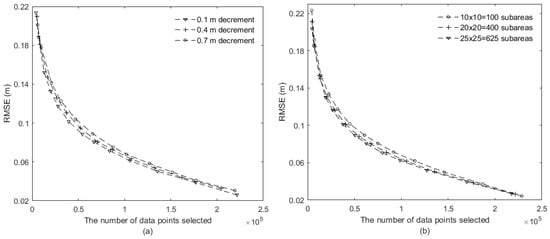 For a given threshold RMSE in the coarse-to-fine method, the set of data points selected is affected by (1) the interval (e.g., 0.2 m used in Section 4.1) of the voxel edge length decreasing from a large value (i.e., coarse-resolution) to a small value (i.e., fine-resolution), and (2) the size of individual sub-areas. When a smaller interval is used, more varied data density bands are available. This will lead to a sub-sampled point cloud that has a smaller difference to the original point cloud, which is confirmed by the analysis results shown in Figure 9a. When a smaller sub-area size (i.e., more sub-areas) is used, the local surface roughness or complexity is better represented by the finer resolution, which also leads to a more favourable sub-sampled point cloud (Figure 9b). However, the increase in accuracy is less significant when the number of sub-areas used is large (e.g., from 400 to 900 sub-areas).